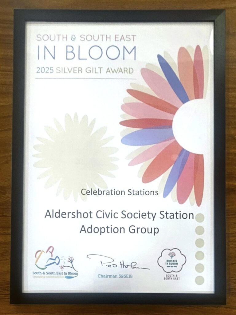 Here we can see Judy receiving the award on behalf of our small group of regular gardeners who tend to the planters, garden and keep Aldershot Station looking so good. Well done to all involved!